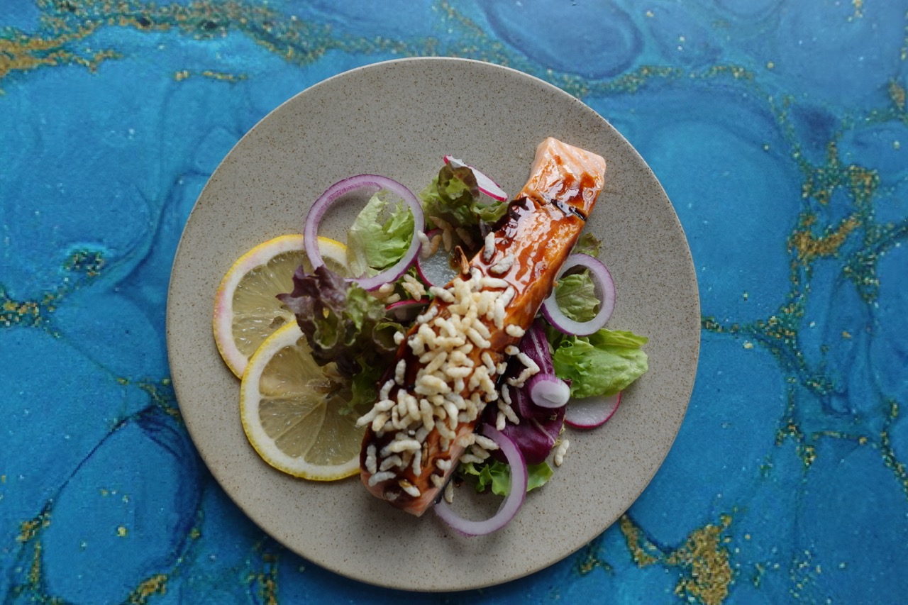- Plaats wat sla op een bordje, leg hier de strook zalm op en besmeer de zalm met je eigengemaakte teriyaki saus. Top af met de gepofte wilde rijst