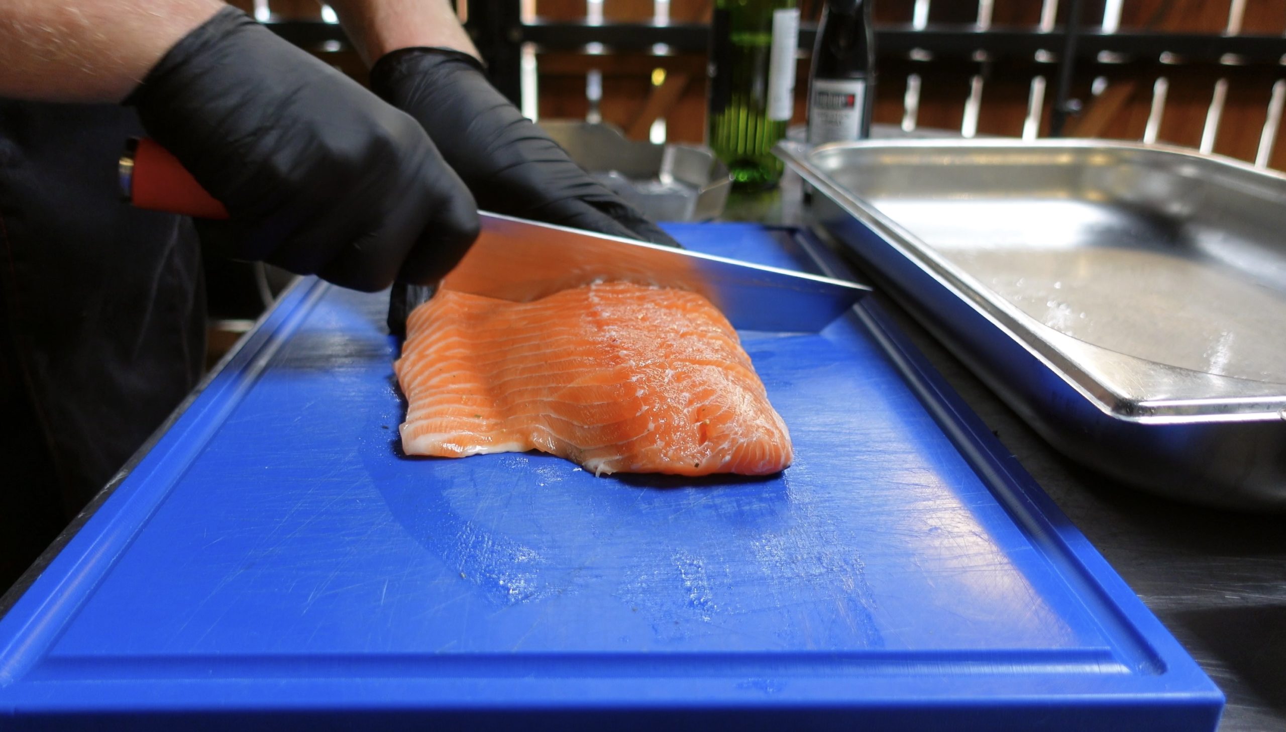 - Pekel de halve zalm zijde door er royaal zout overheen te strooien. Laat een uur pekelen
