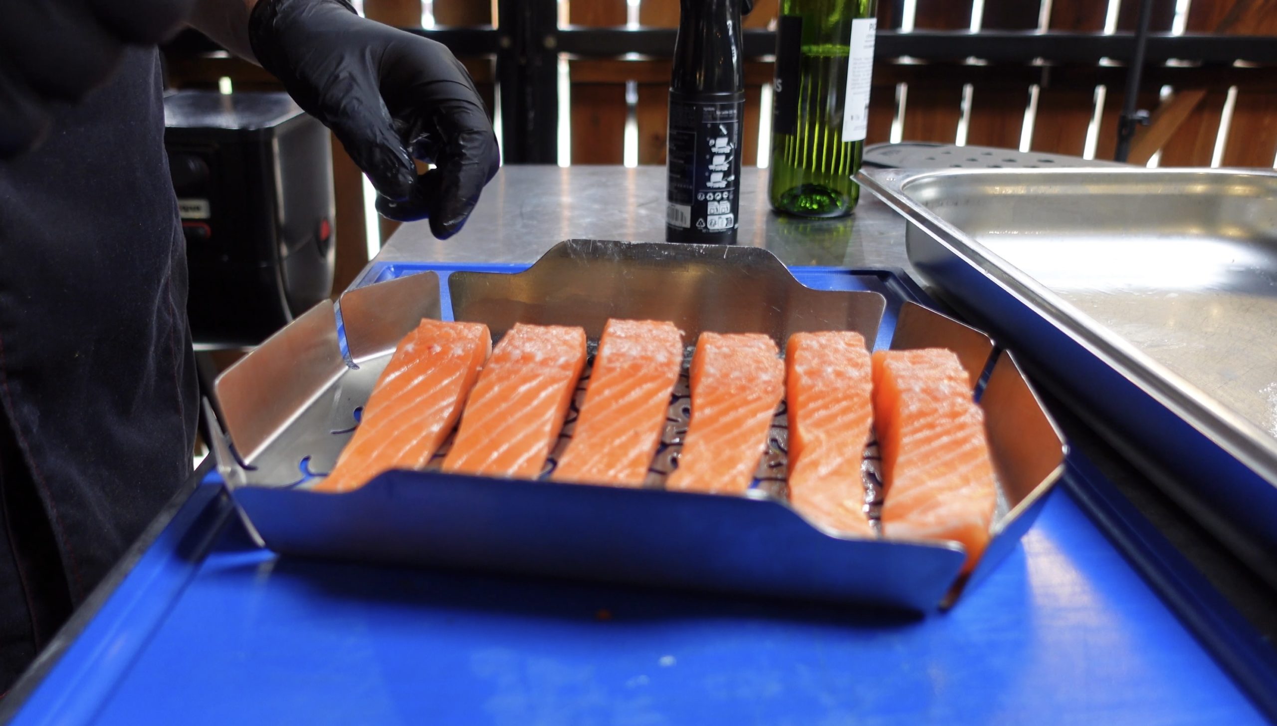 - Snijd de zalm in het aantal gewenste stroken. Spray wat non-stick spray op het stoommandje en plaats de stroken zalm in het stoom mandje