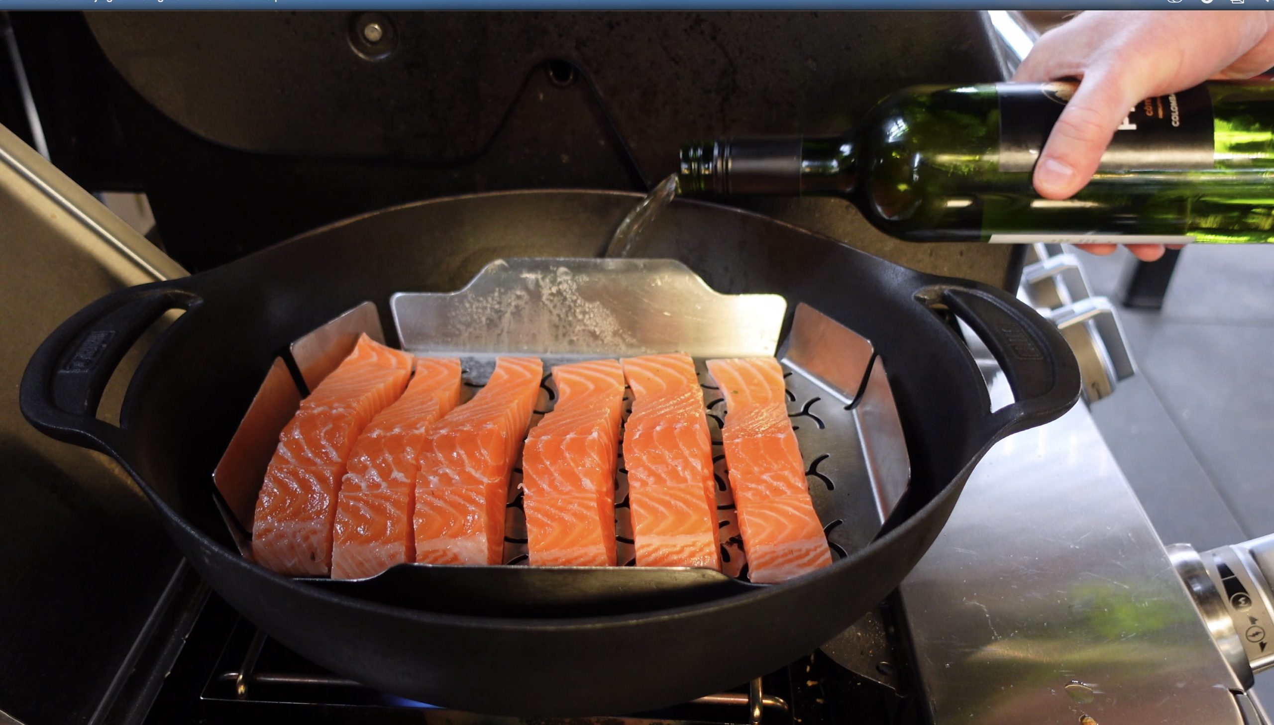- Plaats het stoommandje met de zalm in de wok en giet hier een royale hoeveelheid witte wijn naast. Plaats de deksel op de wok.