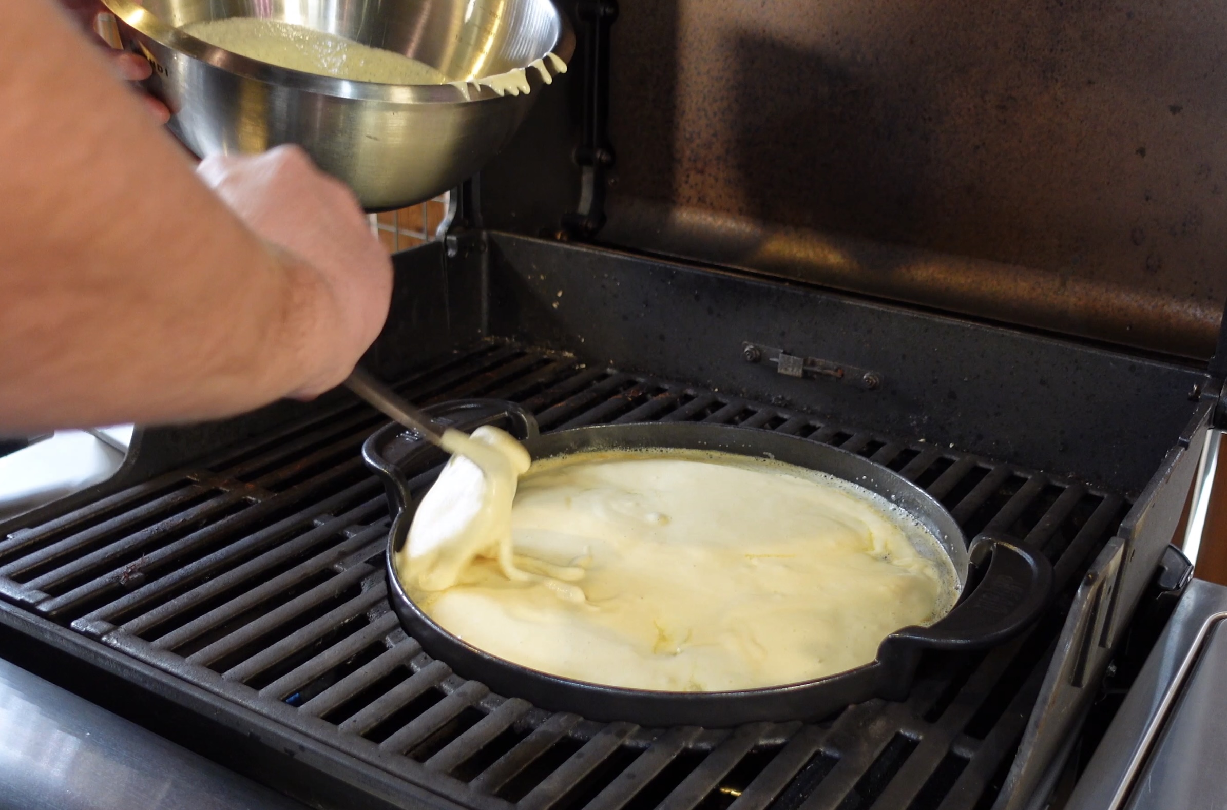 - Giet een ruime hoeveelheid beslag in de plancha en bak voor 3 tot 5 minuten