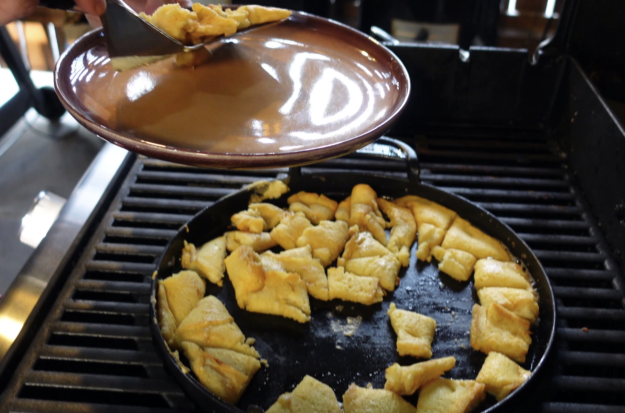 - Bak de Kaiserschmarnn totdat ze mooi van kleur zijn en haal ze van de barbecue. Houdt ze warm in de oven (75 graden) of onder aluminiumfolie