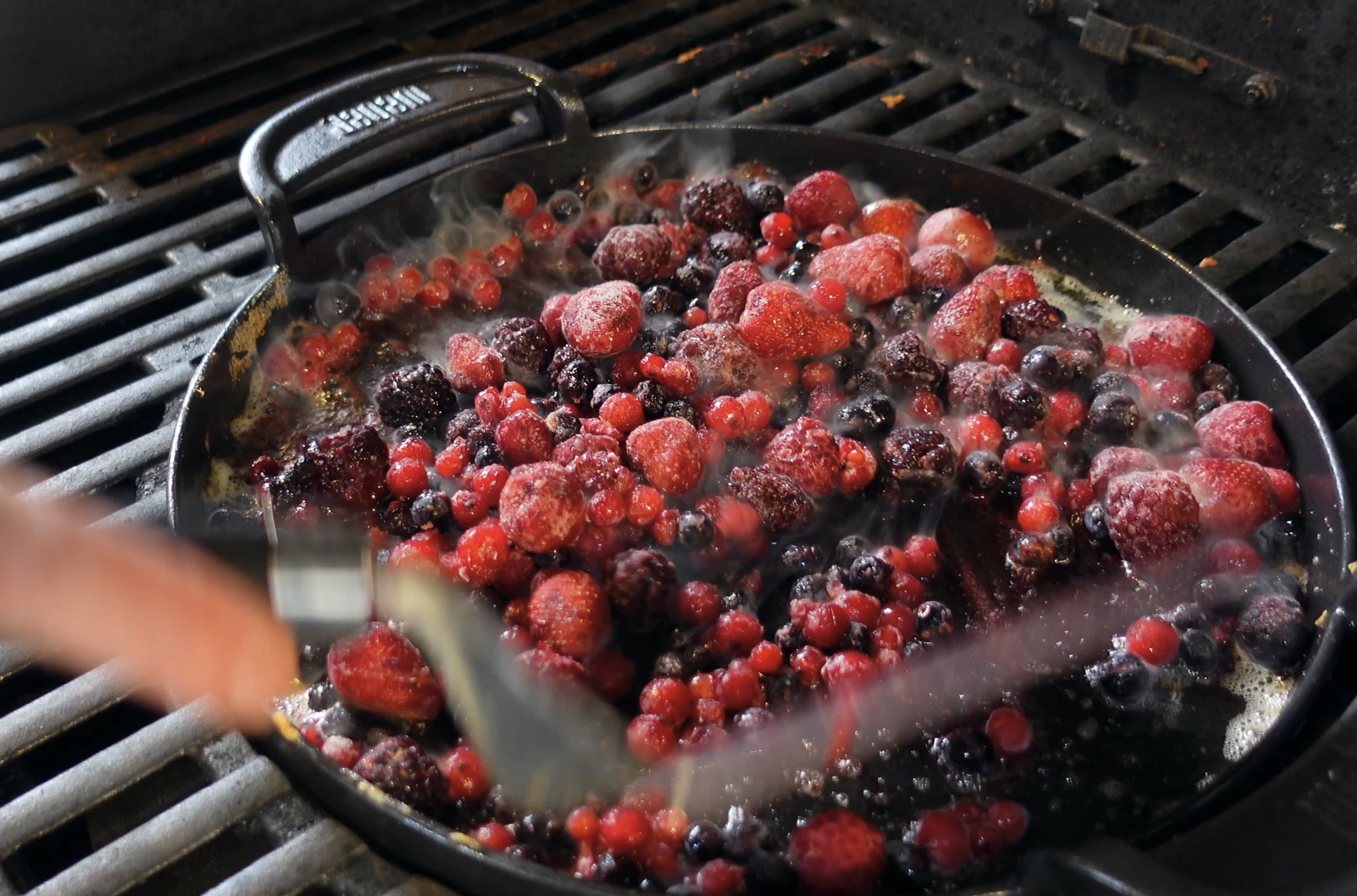 - Zet de plancha terug op de barbecue en smelt de boter voor het rood fruit