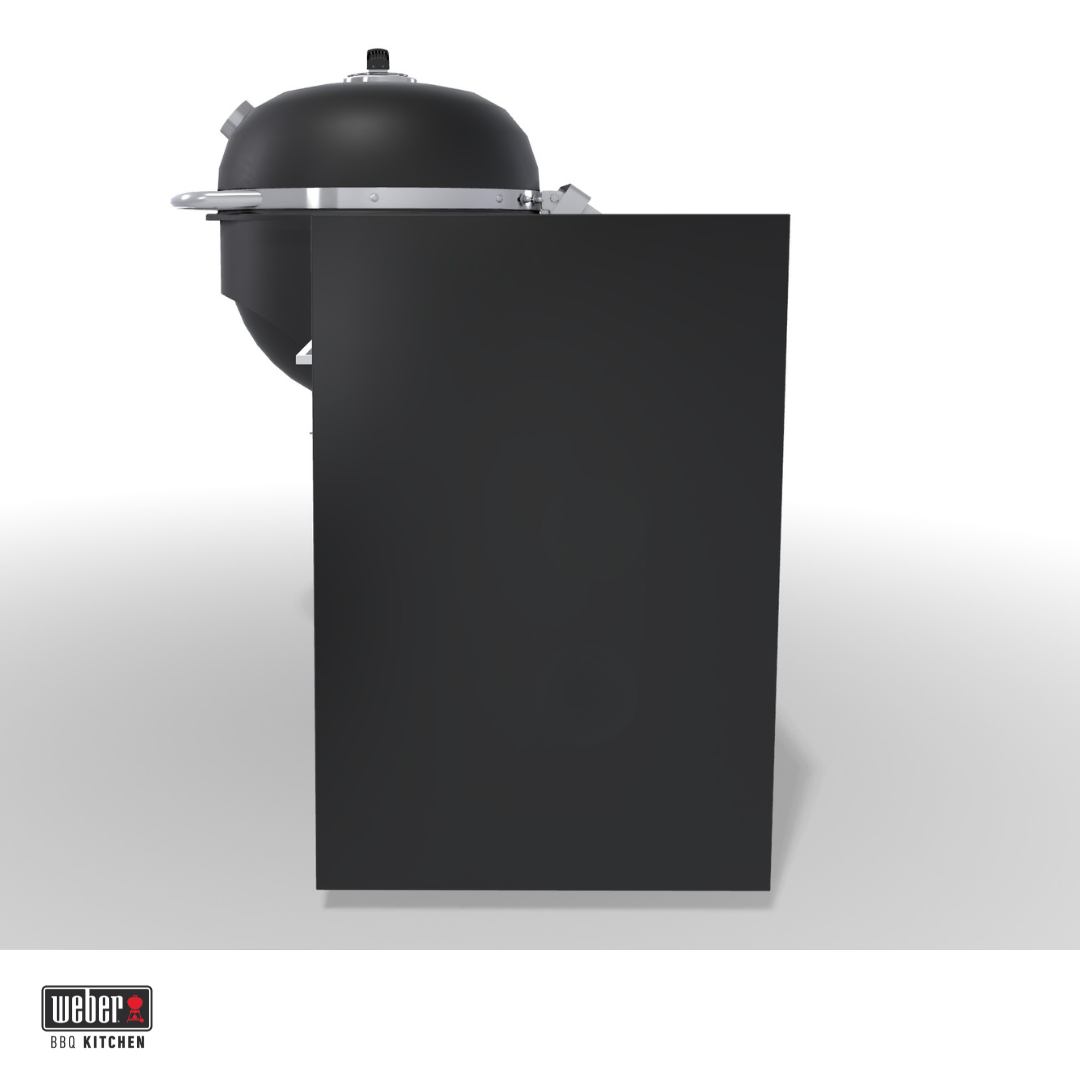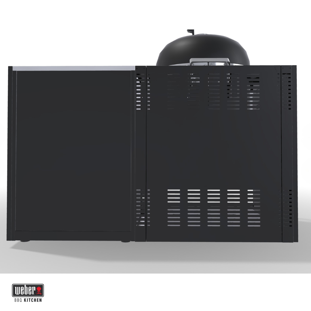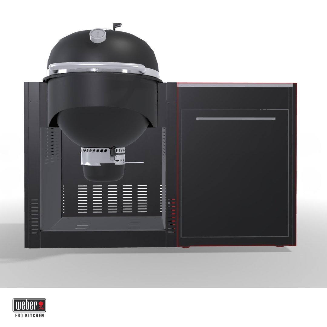 Deze BBQ Kitchen is een complete buitenkeuken met een ingebouwde Weber Summit Kamado E6. Je koopt dus in één keer een werkende, vaste opstelling waarin barbecue en werkruimte gecombineerd zijn. De indeling is praktisch: rechts of links werkruimte voor voorbereiding met een kastmodule voor opslag en aan de andere kant je kamado. Hierdoor heb je alles bij elkaar en werk je overzichtelijker dan met een losse barbecue. De Summit Kamado E6 is een veelzijdige houtskoolbarbecue met een groot grilloppervlak van 61 cm. Door de dubbelwandige isolatie warmt hij snel op en blijft de temperatuur stabiel, terwijl het verbruik laag blijft. Je kunt er zowel op lage temperatuur mee garen als op hoge temperatuur grillen.